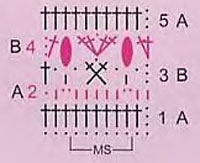 Число петель кратно 6 + 5 + 3 возд. п. подъема. Вязать по схеме. 1-ю петлю каждого р. заменять на возд. п. подъема. Начать с петель перед раппортом, повторять раппорт, закончить петлями после раппорта. Повторить 1 раз с 1-го по 5-й р., затем повторять со 2-го по 5-й р., соблюдая чередование цветов.