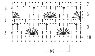 2-й р.: 1 возд. п. подъема, *1 ст. б/н в следующий ст. б/н предыдущего ряда, 1 возд. п., пропустить 1 ст. б/н предыдущего ряда, 1 ст. б/н в следующий ст. б/н предыдущего ряда, 9 ст. с/н за следующую арку из 4 возд. п., повторять от *, закончить 1 ст. б/н в следующий ст. б/н предыдущего ряда, 1 возд. п., пропустить 1 ст. б/н предыдущего ряда, 1 ст. б/н в последний ст. б/н предыдущего ряда.