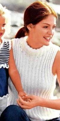 Изысканный и женственный комплект с пересекающимся ажурным узором на пуловере и жилете. Выглядят эффектно как в паре, так и по отдельности. Размер: 38-40.
