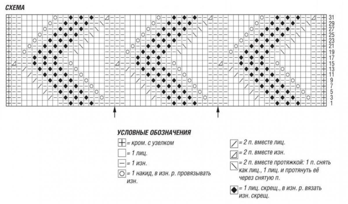 Край с узелками: 1-ю п. каждого ряда снять как лиц. Последнюю п. каждого ряда провязать лиц. Все детали выполнять с узелковыми краями. Зигзагообразный ажурный узор: вязать по схеме. В изн. р. вязать по рисунку или по обозначениям. Начинать с петель перед 1-й стрелкой, повторять 20 п. раппорта между стрелками, заканчивать петлями после 2-й стрелки. На схеме приведены 3 раппорта. Повторять 1-й -32-й р.