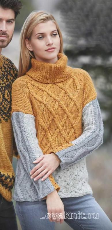 Вам потребуется: пряжа Katia «Merino Tweed» (51% шерсти, 45% акрила, 6% вискозы: 80 м/100 г) - 7 (8) 8 (9) мотков горчично-желтой (№ 411), 3 (3) 4 (4) мотка серой (№ 307), 2 (3) 3 (3) мотка цвета экрю (№ 300); спицы №5.