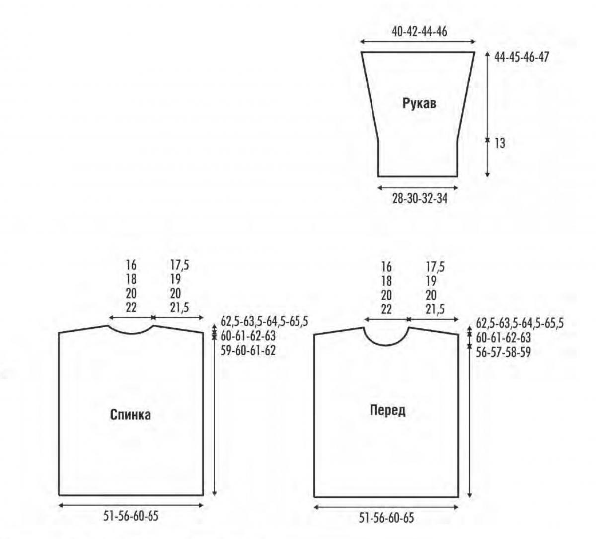 Спинка: на спицы № 5 нитью цвета экрю набрать 50 (54) 57 (61) п. и серой нитью 32 (36) 39 (43) п. = 82 (90) 96 (104) п. и вязать 4 р. платочной вязкой в технике интарсия. Продолжить работу, распределив петли узоров и цвета нитей следующим образом: серой нитью: 3 п. лицевой глади, 3 (5) 6 (8) п. изнаночной глади, 21 п. волнистого узора 2 (= петли от А до А на схеме), 2 (4) 6 (8) п. изнаночной глади, 3 п. лицевой глади; нитью цвета экрю: 3 (5) 2 (4) п. лицевой глади, 44 (44) 54 (54) п. структурного узора 1, повторяя раппорт от А до А (от А до А) от В до В (от В до В), обозначенный на схеме, 3 (5) 1 (3) п. лицевой глади. Через 20 см от наборного ряда на всех петлях вязать горчично-желтой нитью, распределив петли узоров так: 3 п. лицевой глади, 14 (18) 21 (25) п. изнаночной глади, 48 п. узора из ромбов, 14 (18) 21 (25) п. изнаночной глади, 3 п. лицевой глади. Через 36 см от смены цвета нити (= в высоту выполнено 3 раппорта узора из ромбов), продолжать работу изнаночной гладью - за исключением первых и последних 3 п. лицевой глади. Через 39 (40) 41 (42) см от смены цвета нити закрыть для горловины средние 20 (22) 26 (30) п. и далее обе стороны вязать раздельно. Для закругления горловины закрыть с внутреннего края в начале каждого лицевого ряда 3 х 1 п. Одновременно через 1 см от начала горловины закрыть с внешнего края для плечевого скоса в начале каждого изнаночного ряда 2 х 9 п., 1 х 10 п. (2 х 10 п., 1 х 11 п.) 1 х 10 п., 2 х 11 п. (2 х 11 п., 1 х 12 п.). Вторую сторону закончить симметрично.
