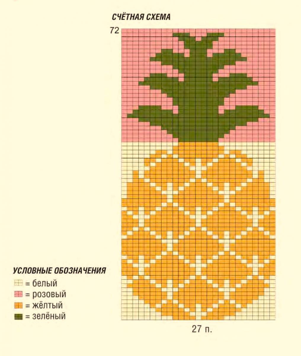 Мотив «ананас»: вязать лиц. гладью в технике интарсии по счётной схеме от отдельных клубков, при смене цвета перекрещивая нити на изн. стороне, чтобы не возникало отверстий. На схеме приведены лиц. и изн. р. Мелкие фрагменты мотива можно вышить по петлям.