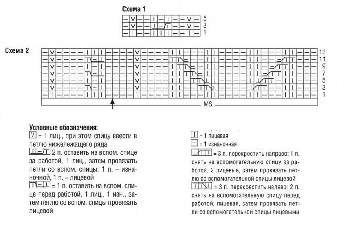 «Коса» (на 11 п.): вязать по схеме 1. На схеме даны только лицевые ряды. В изнаночных рядах петли вязать по рисунку. В высоту с 1-го по 6-й р. выполнить 1 раз, затем повторять с 3-го по 6-й ряд.