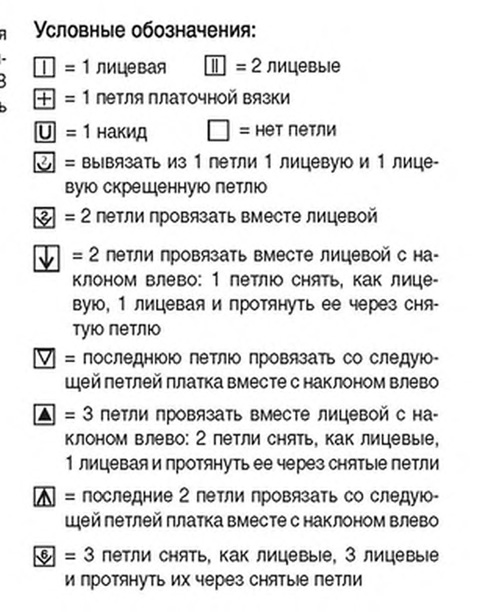 1 лицевая,' 1 накид, 3 лицевые, 1 накид 1 лицевая, повторить от' 3 раза, 2 п. платочной вязкой = 29 п.; 21-й ряд: провязать 2 п. платочной вязкой, 1 лицевая, ' 2 п. вместе лицевой с наклоном влево, 1 накид. 2 п. вместе лицевой с наклоном влево. 1 накид.