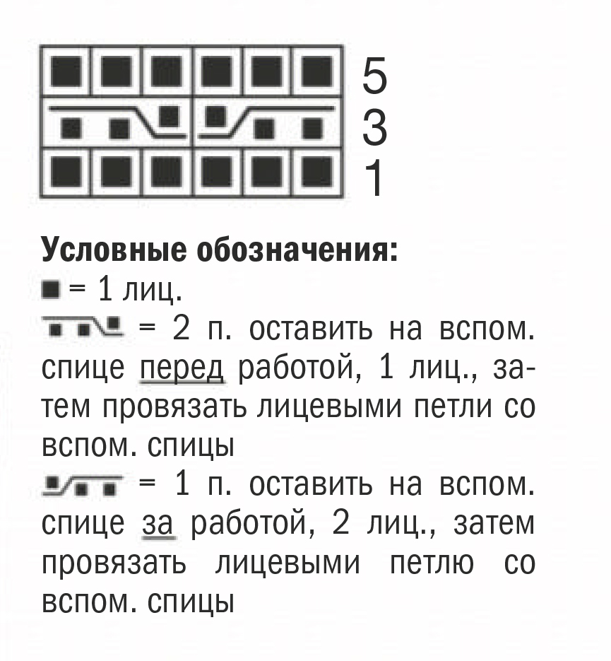 Узор «Коса»: вязать на 6 п. по схем. Постоянно повторять 1-6-й ряды.