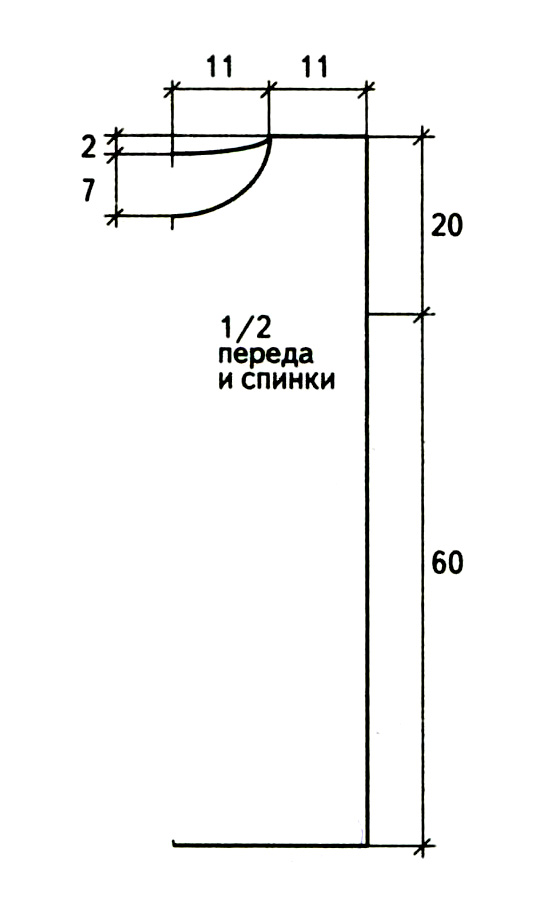 Перед: вяжите аналогично спинке, но с более глубоким вырезом горловины. Для этого на высоте 71 см от начального ряда для выреза горловины закройте средние 8 п. и каждую сторону вяжите отдельно. Для закругления выреза горловины с внутренней стороны закройте: 2-й, 4-6-й ряды - по 1 п., 3-й ряд 2 п., 7-й, 9-й,11 14-й ряды вяжите без убавлений, 8-й, 10-й ряды по 1 п. Оставшиеся 15 п. плеча закройте за один прием. Вторую сторону вяжите симметрично.