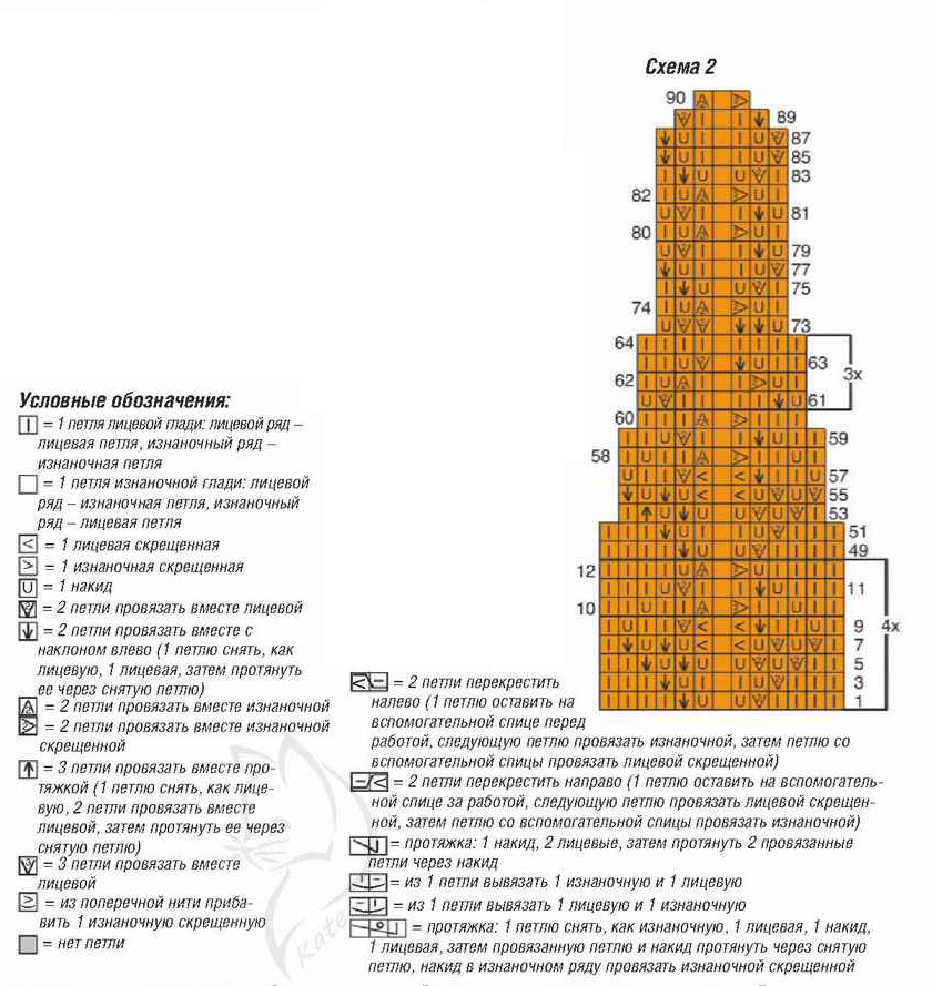 Узор 3: ажурный узор В = вязать, как узор 2, но на ажурных полосах узора 2 теперь вязать ажурные полосы (вначале = 13 п.) сот. схеме 2, они для наглядности выделены цветом. Между ними продолжить провязывать петли узора 1. «косы», а также половины «кос» узора 2. На схеме даны все лицевые ряды. Изнаночные ряды приведены только в случае выполнения убавок. В неприведенных изнаночных рядах все петли провязывать по рисунку, лицевые скрещенные провязывать изнаночными скрещенными. накиды провязывать изнаночными. Выполнить 4 раза 1-12-й ряды (= 48 рядов), затем 1 раз выполнить 49-60-й ряды, 3 раза выполнить 61-64-й ряды (= 12 рядов), закончить 73-90-м рядами.