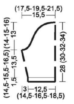 Описание работы: на круговые спицы № 4 набрать 176 (194 -212) 228 п. и для планки провязать 1,5 см - 5 круг.р. мелким жемчужным узором. Далее вязать лицевой гладью. Отметить боковые швы - начало кругового ряда и половину вязания = 88 (97 - 106) 114 п. на каждую половину. Для приталивания перед и после отмеченных боковых швов в следующем 12-м круг.р. убавить 1 х 1 п. и затем убавить в каждом 10-м круг.р. 4 х 1 п. (в каждом 12-м круг.р. 3 х 1 п. и в каждом 10-м круг.р. 2 х 1 п. - в каждом 12-м круг.р. 5 х 1 п.) в каждом следующем 14-м круг.р. 1 х 1 п. и в каждом 12-м круг.р. 4 х 1 п., для чего после меток провязать вместе с наклоном влево 2 п. лицевой (- 1 п. снять, как при лицевом вязании, 1 лиц., затем снятую петлю протянуть через нее) и 2 п. перед меткой провязать вместе лицевой = 156 (174 - 192) 208 п. Затем в каждом 16-м круг.р. прибавить перед и после боковых швов 3 х 1 п. (в каждом 18-м круг.р. 2 х 1 п. и в каждом 16-м круг.р. 1 х 1 п. - в каждом 18-м круг.р. 3 х 1 п.) в следующем 20-м круг.р. 1 х 1 п. и в каждом 18-м круг.р. 2 х 1 п., для чего по 1 лиц. скрещенной вывязать из протяжки - 168 (186 - 204) 220 п. Через 20 (21 - 22) 23 см = 64 (68 -70) 74 круг.р. от последней прибавки работу разделить у боковых швов и сначала закончить перед - 84 (93- 102) 110 п. для каждой половинки. Для проймы по правому краю закрыть 1 х 3 п. и в каждом 2-м р. 2 х 2 п. и 1 (2 - 3) 4 х 1 п. Одновременно для проймы и выреза горловины по левому краю закрыть 1 х 8 п. и в каждом 2-м р. закрыть еще 1 х 5 п., 6x4 п., 5 (6- 7) 7x3 п., 4 (4-4) 5х 2 п. и 5 (7 -9) 11x1 п. Через 14,5 (15,5-16,5) 17,5 см = 46 (52-58) 64 р. от начала пройм для плечевого скоса по правому краю закрыть 1 х 5 (7 - 8) 10 п. и в следующем 2-м р. 1 х 6 (7 - 9) 10 п. Спинку закончить симметрично.