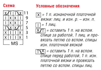 Для следующих узоров: число петель кратно 4 + 2 кром. Вязать по схеме, на которой приведены только лиц. р., в изн. р. петли вязать по рисунку или как указано. Повторять между кром. раппорт.