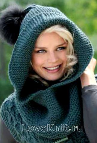 Вам потребуется: для жилета 500 (550) 600 г и для шарфа-капюшона 350 г сине-зелёной пряжи Everybody Unito (80% натуральной шерсти, 20% полиамида, 75 м/50 г); прямые и круговые спицы № 7; 5 зелёных пуговиц-палочек; меховой помпон.