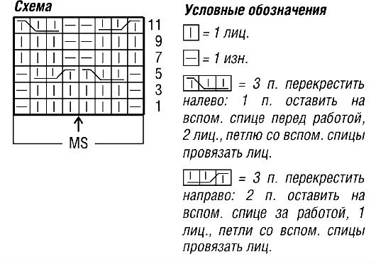 Рельефный узор: ширина 8 п. Вязать по схеме, на которой приведены лиц. р. В изн. р. вязать петли по рисунку. Повторять петли раппорта и с 1-го по 12-й р.